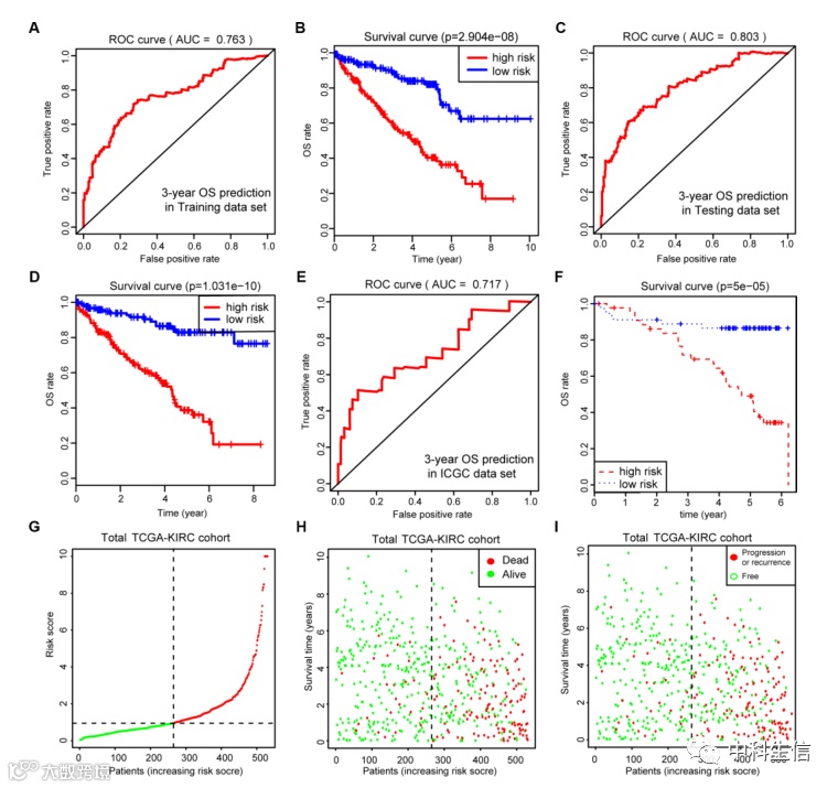 对MAGs进行内部和外部验证,以确定其临床预测价值(图3)。(A,C)在预测训练和测试队列中的3年OS事件时,ROC曲线的AUC分别为0.763和0.803。(B,D)此外,Kaplan-Meier分析表明,MAGs评分高的患者OS预后显著较差(P=2.904e-08),这在测试队列中得到了一致验证。(E,F)此外,我们还在一个独立的ICGC队列中证实了我们的发现,并观察到了类似的统计结果。(G–I)我们进一步将MAGs特征与TCGA-KIRC队列中的生存分析相结合,分布图表明,MAGs高风险评分与更多死亡和复发/进展病例相关。