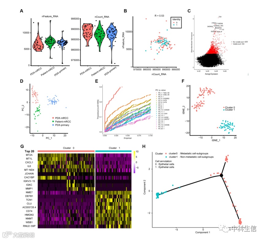 121个细胞的单细胞RNA测序特征和标记基因的筛选(图1)。(A,B)三个细胞亚群的scRNA-seq的质量控制。我们筛选出质量较差的细胞,并分析检测到的基因计数与测序深度之间的正相关性。(C) 我们鉴定了细胞间存在显著差异的基因符号,并绘制了特征方差图。(D,E)主成分分析(PCA)是一种线性降维方法,用于识别具有估计P值的数据集的显著可用维度。因此,我们将细胞组分为三类。(F) 基于PCA中可用的重要成分,我们进行了另一种非线性降维,即TSNE算法,以根据实际细胞类型成功地将细胞划分为两个簇。(G) 在两个聚类之间构建了logFC=0.5和adjPval=0.05的差异分析,以确定重要的标记基因,我们展示了热图包中的前20个。(H) 细胞注释和轨迹分析揭示了从原发性肾细胞癌到转移性肾细胞癌的趋势曲线,表明它们之间的基因组变化。