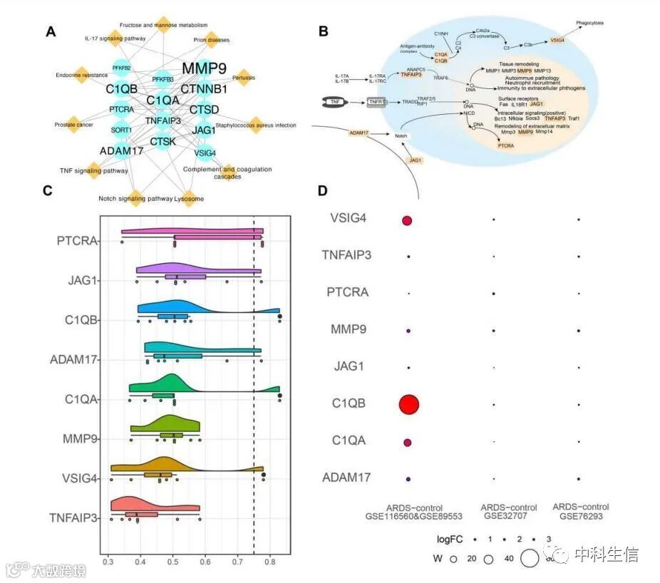 基于STRING数据库构建了PPI蛋白质互作网络,25个结点,189个互作对。鉴定除了8个和ARDS患者通路有关的核心基因:PTCRA, JAG1, C1QB, ADAM17, C1QA, MMP9, VSIG4 和 TNFAIP3。