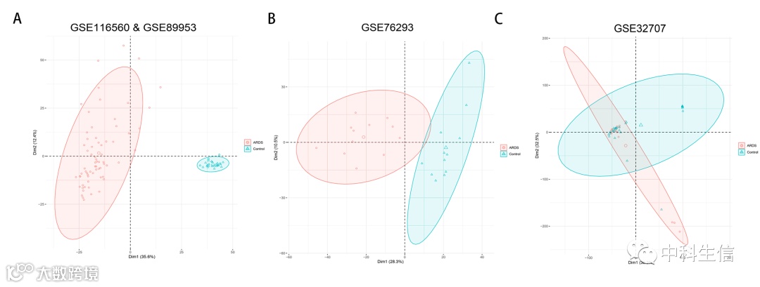 用R语言的ggbiplot包进行主成分分析,鉴定出的差异表达基因可能是宿主巨噬细胞对ARDS的反应,所有的差异基因都是用R语言中的limma包完成,差异选择标准为p value<0.05,|logFC|>1。