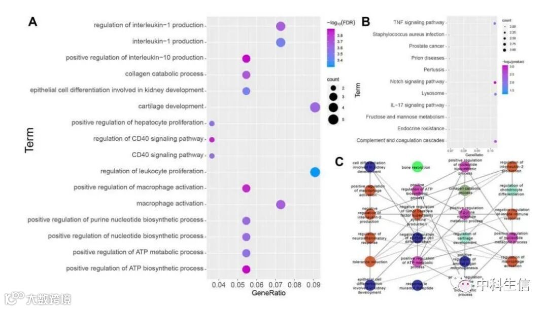 GO分析结果表明多个基因主要涉及与代谢和炎症相关的生物过程,KEGG结果表明差异表达基因主要富集与ARDS相关通路,如Notch the tumor necrosis factor (TNF) 、the tumor necrosis factor (TNF) 和complement and coagulation cascades通路。