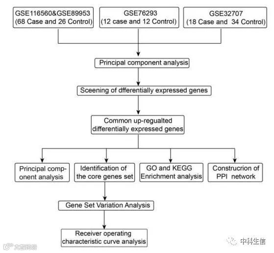 从Gene Expression Omnibus (GEO)数据库中下载了3个数据集,和相关的基因注释信息和患者临床信息,用R语言limma包中的normalizeBetweenArrays函数对数据进行标准化和归一化,利用GEO数据库中标注的平台信息把标签名转换为基因名。