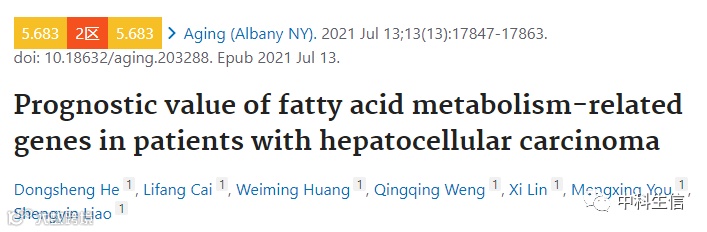 早!今天小编和大家分享一篇前不久发表在Aging(IF:5.683)杂志的文章,题目是Prognostic value of fatty acid metabolism-elated genes in patients with hepatocellular carcinoma。文章基于脂肪酸代谢相关基因构建肝细胞癌预后模型。