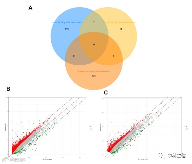 图 1. HCC 中差异表达的脂肪酸代谢基因的鉴定。( A)三个脂肪酸代谢基因组的维恩图。( B)TCGA中HCC患者的12450个差异表达基因。( C)ICGC中HCC患者的2939个差异表达基因。
