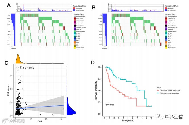 图 9. 高危和低危 HCC 患者 TMB 的差异。( A ) 高危 HCC 患者的 TMB。( B)低风险 HCC 患者的 TMB。( C ) TMB 与 HCC 患者的风险评分呈正相关。( D )高危、高TMB的HCC患者的OS低于低危、低TMB的HCC患者。