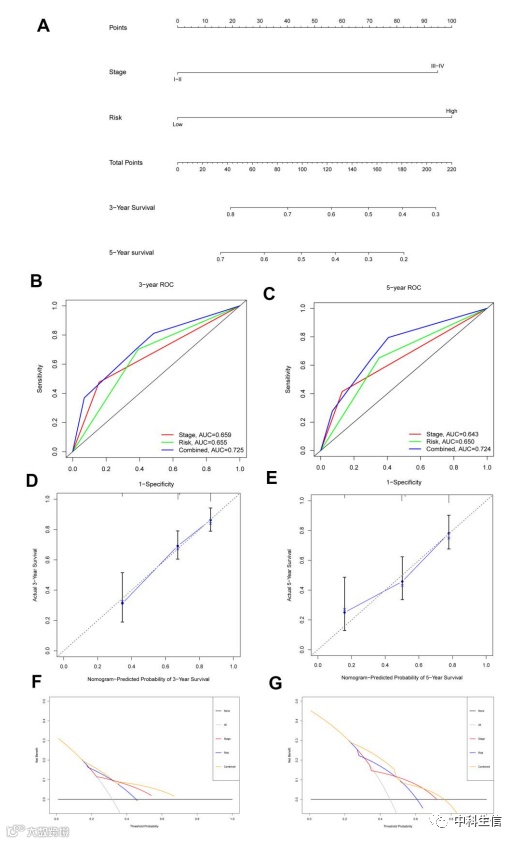 图 8. 预测 3 年和 5 年 OS 的列线图及其在 HCC 患者中的验证。( A ) 列线图预测 HCC 患者的 3 年和 5 年 OS。( B, C)ROC 曲线,用于评估列线图预测 HCC 患者 3 年和 5 年 OS 的准确性。( D , E ) 校准图分析以评估列线图预测 HCC 患者 3 年和 5 年 OS 的准确性。( F , G ) DCA 评估列线图预测 HCC 患者 3 年和 5 年 OS 的准确性。