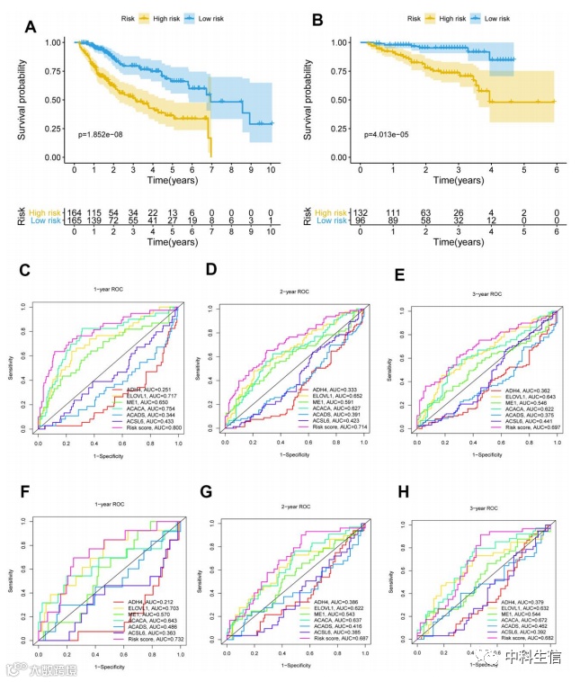 图 4. HCC 患者风险预后模型的 KM 生存分析和 ROC 曲线。( A, B)TCGA和ICGC中HCC患者风险预后模型的Kaplan-Meier生存分析。( C - E ) TCGA中HCC患者1年、2年和3年风险预后模型的ROC曲线分析。( F – H ) ICGC HCC患者1年、2年、3年风险预后模型ROC曲线分析。