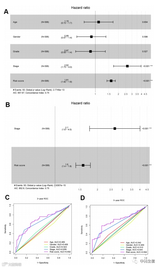 通过整合TCGA数据库中HCC患者的临床数据和风险评分,提取了306例患者的综合数据,进行单变量和多变量Cox回归分析确定HCC患者的独立预后参数。