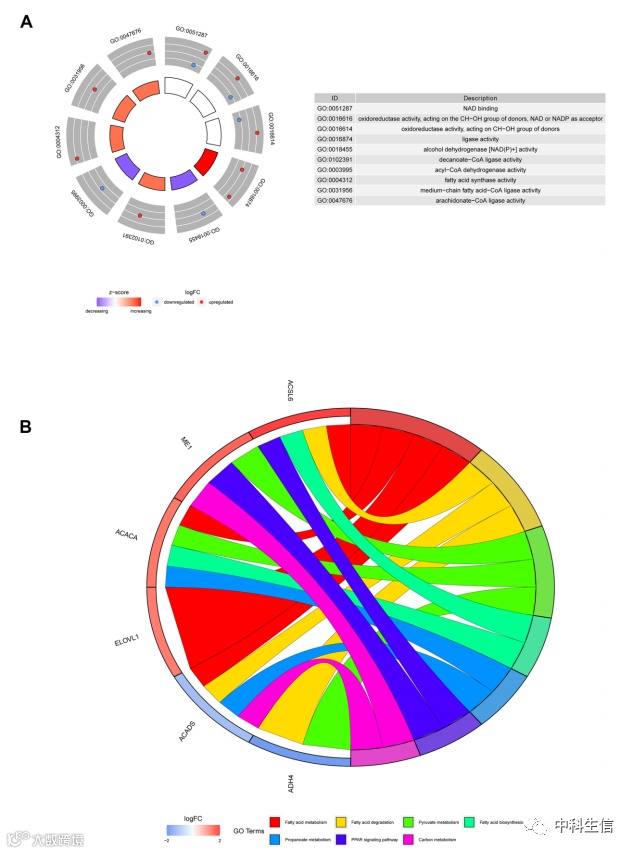 GO分析表明6 个筛选基因的最高度富集的分子功能是烟酰胺腺嘌呤二核苷酸 (NAD) 结合、氧化还原酶活性和脂肪酸活性。此外,KEGG通路分析表明这 6 个基因可能参与与脂肪酸代谢相关的通路。