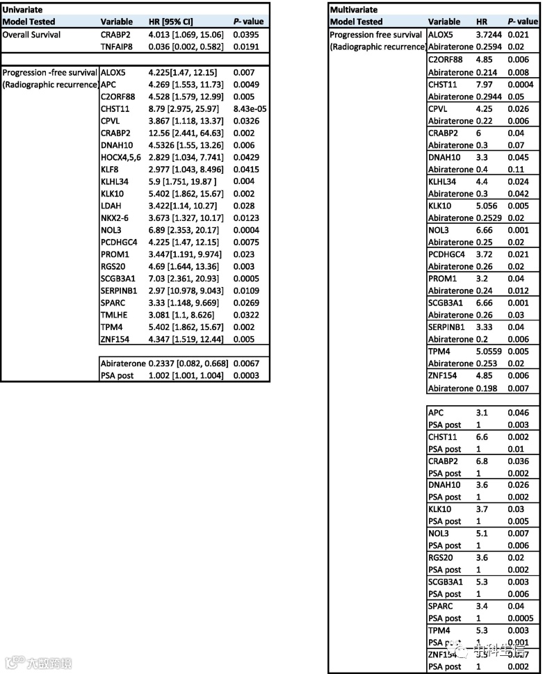接下来,我们进行了单变量和共变量的考克斯回归分析,以确定我们的标记物对总生存期(OS)和rPFS的预后价值。对于OS,在单变量分析中,CRABP2和TNFAIP8的甲基化是治疗后患者血浆中重要的预后因素(HR为4.013和0.036;P值为0.0395和0.0191),但在包括治疗或PSA水平为变量的共变数模型中并没有保持显著性(表1)。对于rPFS,在单变量cox回归分析中,23个单独的标记基因的甲基化是疾病复发的负面预后因素,危险比(HR)从2.829(HOCX4,5,6,p = 0.04)到12.56(CRABP2,p = 0.002)。由于大多数反应者患者接受了醋酸阿比特龙治疗,因此进行了协变量考克斯回归。尽管醋酸阿比特龙治疗显示出对放射学复发的显著预测价值(HR 0.2337,p = 0.0067),但15个候选标记物的甲基化仍然是一个独立的重要预测因素,HR从3.2(PROM1,p = 0.04)到7.968(CHST11,p = 0.0004)(表1)。值得注意的是,在调整了PSA这一变量的共变分析中,有11个标记基因也仍然显著(HR为3.1-6.8),表明我们的标记基因适合于独立于PSA水平的预后。