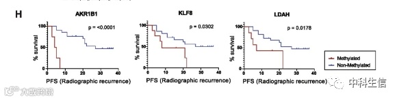 为了测试我们的甲基化标志物是否能预测临床结果,如放射学无进展生存期(rPFS),我们利用治疗后血浆中候选基因的甲基化水平进行生存统计。Kaplan-Meier生存分析显示,包括三个特征基因(AKR1B1、KLF8、LDAH)在内的几个候选标记物的甲基化与rPFS下降有明显的关联(图1H)。