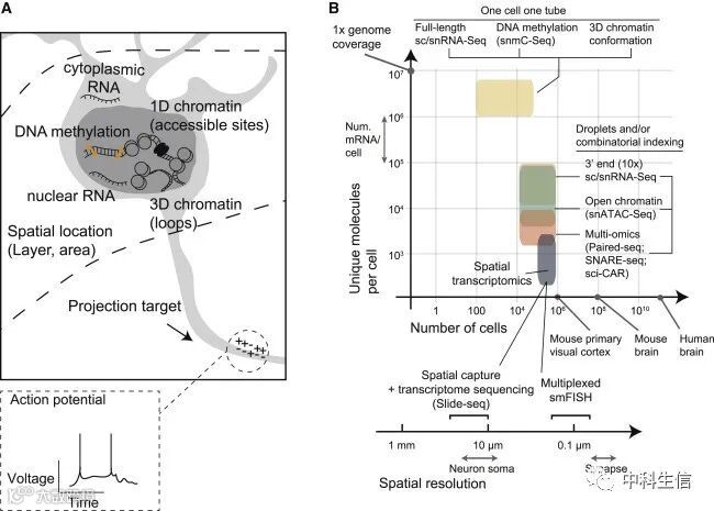 单细胞测序技术测量来自单个细胞的RNA或DNA,而不需要选择性的细胞纯化。这些技术可以概括为三个特征:范围(细胞数量)、粒度(基因或表观遗传特征数量)和空间分辨率(图1B)。此外,单细胞技术还可以测量不同类型的RNA转录本或表观遗传修饰。虽然单细胞测序不需要细胞纯化,但它确实依赖于高质量的初级或冷冻组织,这些组织是从专家仔细解剖的神经解剖区域获得的。