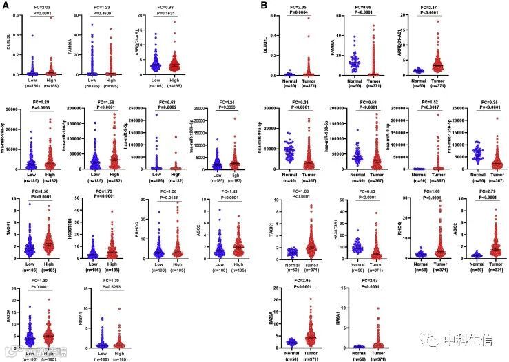 考虑到lncRNA的细胞定位决定潜在机制,分析了三种 DElncRNA的亚细胞定位。如图7A所示,DLEU2L主要位于细胞质中,而另外两个lncRNA(FAM99A 和 ARRDC1-AS1)主要分布在胞质溶胶中。这些数据表明,DLEU2L可能通过海绵miR-99a-5p/miR-100-5p来提高TAOK1的表达。因此,构建了DLEU2L-miR-100-5p/miR-99a-5p-TAOK1 ceRNA网络(图7B)。图7C miR-99a-5p和miR-100-5p与DLEU2L和TAOK1 3'UTR 中靶位点之间的碱基配对。此外,表达相关性分析表明DLEU2L表达和TAOK1表达之间存在正相关关系(图7D)。因此,选择ceRNA网络中的DLEU2L/TAOK1轴作为下一步分析的潜在预后模型。