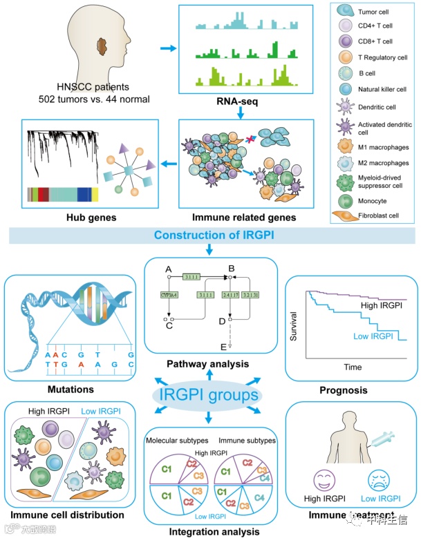 与传统疗法相比,免疫检查点抑制剂(ICI)疗法在提高生存率方面效果显著。目前,ICI治疗已被证明是治疗头颈部鳞状细胞癌(HNSCC)的一种有前途的治疗方法。然而,ICI治疗的主要局限性是患者对ICI治疗的应答率低,自付医疗费用高。因此,迫切需要全面了解HNSCC的肿瘤微环境,寻找有价值的生物标志物来预测免疫治疗对HNSCC患者的疗效。在这项研究中,作者聚焦于HNSCC转录组数据中的所有免疫相关基因,通过加权基因共表达网络分析(WGCNA)筛选与患者预后相关的免疫相关枢纽基因,构建免疫相关基因预后指数(IRGPI)。然后,作者对IRGPI的分子和免疫特征进行了表征,检查了其在免疫治疗患者中的预后能力,并将其与其他生物标志物、肿瘤免疫功能障碍和排斥(TIDE)以及肿瘤炎症信号(TIS)进行了比较。结果表明,对于接受传统治疗和免疫治疗的患者,IRGPI是一种有前途的预后生物标志物。
