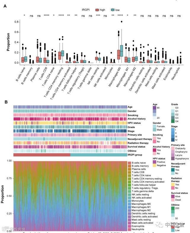 图3:HNSCC的肿瘤微环境(TME)景观和不同IRGPI亚组的特征。(A)不同IRGPI亚组中TME的比例。我们发现CD8T细胞、原始CD4 T细胞、活化记忆CD4 T细胞、静息NK细胞和M1巨噬细胞在IRGPI高分亚组中更为丰富,而在IRGPI低分亚组中原始B细胞、静息记忆CD4 T细胞和M2巨噬细胞更为丰富。(B)TCGA库中502例患者的IRGPI分组和TME细胞比例。结果显示,IRGPI-高亚组CD8T细胞、MHC-I类、损伤修复较多,而IRGPI-低亚组有较多免疫抑制细胞和信号,肿瘤及转移相关信号较多。