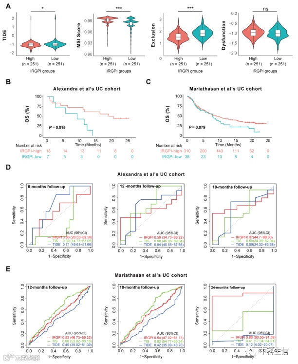 图5:IRGPI在接受抗PD-L1治疗的患者中的预后价值。(A)不同IRGPI亚组的TEDE、MSI、T细胞排斥和功能障碍评分。在结果中,IRGPI高亚组的潮汐评分低于IRGPI低亚组,这意味着IRGPI高的患者可以比IRGPI低的患者从ICI治疗中获益更多。(B)Alexandra等人的尿路上皮癌队列中IRGPI亚组的Kaplan-Meier生存分析。(C)Mariathasan等人的尿路上皮癌队列中IRGPI亚组的Kaplan-Meier生存分析。(D)对Alexandra等人的尿路上皮癌队列随访6个月、12个月和18个月的总存活率的IRGPI、TIS和TEDGE进行ROC分析。(E)对Mariathasan等人的尿路上皮癌队列随访12个月、18个月和24个月的总存活率的IRGPI、TIS和TEDGE进行ROC分析。