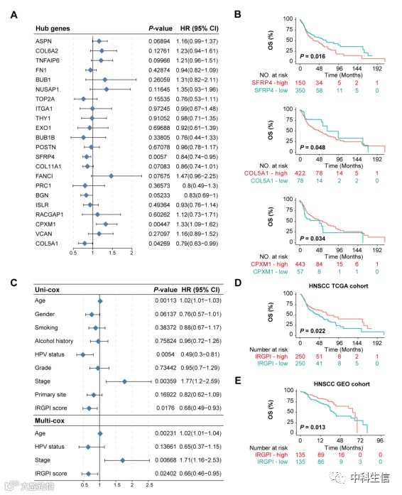 图1:不同IRGPI亚组的预后分析。(A)22个免疫相关HUB基因的单变量Cox分析。(B)单因素Cox分析中,3个基因的Kaplan-Meier生存分析均有统计学意义(p<0.05)。(C)临床病理因素的单因素Cox分析及多因素Cox分析(p<0.05),多因素Cox回归分析证实,在调整其他临床病理因素后,IRGPI是一个独立的预后因素。(D)TCGA库中IRGPI亚组的Kaplan-Meier生存分析,IRGPI高分的患者比IRGPI低分的患者的总存活率高。(E)GEO库中IRGPI亚组的Kaplan-Meier生存分析,IRGPI高分亚组患者的预后明显好于IRGPI低分亚组。