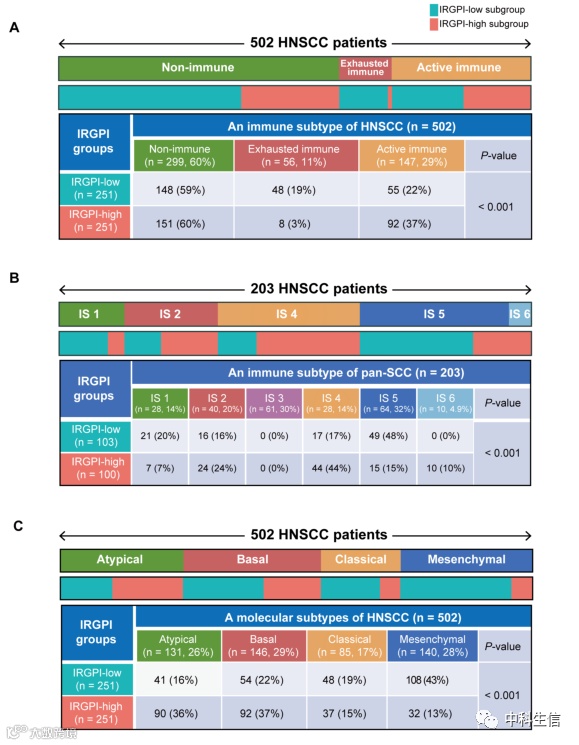 图4:免疫和分子亚型的分布以及不同IRGPI亚组对ICI治疗的免疫应答。(A)展示HNSCC免疫亚型(非免疫、耗尽免疫和主动免疫)在IRGPI亚组之间分布的热图和表格。非免疫样本的比例在两组之间几乎相等,但IRGPI高分亚组的免疫活性样本多于IRGPI低分亚组,而免疫耗尽的样本则少于IRGPI低分亚组。(B) 展示pan-SCC免疫亚型(IS1、IS2、IS3、IS4、IS5和IS6)在IRGPI亚组之间分布的热图和表格。IRGPI低分亚组中IS1和IS5亚型较多,IRGPI高分亚组中IS4亚型较多。(C)展示IRGPI亚组之间分子亚型(基础亚型、间质亚型、非典型亚型和典型型)分布的热图和表格。用卡方检验比较免疫亚型和分子亚型在IRGPI亚组中的分布。其中,典型亚型在两组间分布基本均匀,但IRGPI高分亚组的非典型亚型和基础亚型多于IRGPI低分亚组,间质亚型较少。