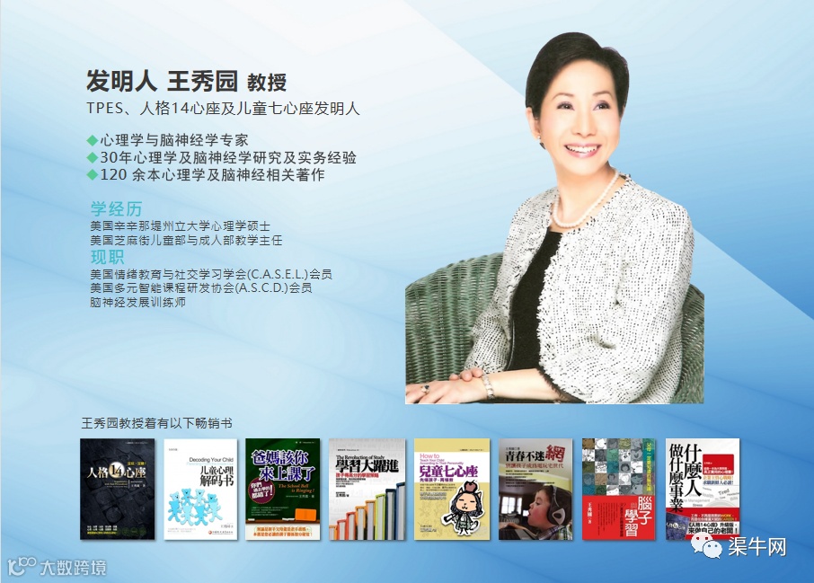 TPES儿童赋能系统是由台湾著名儿童心理学及脑神经学专家王秀园教授主导研发的一款基于多元智能的儿童天赋评测产品,通过线上评测生成报告,再由我们培养的儿童赋能师进行专业问诊、解读分析及持续的跟踪服务,帮助家长定制孩子的天赋潜能培养方案。
