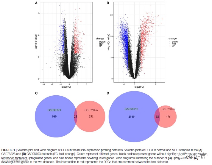 作者研究了来自独立实验的两个微阵列 MDD 数据集(GSE76826和GSE98793),以检测与正常样品相比在 MDD 样品中失调的 DEG。在GSE76826基因芯片中,鉴定出1130个DEG;556个基因上调,574个基因下调。除了GSE98793之外,还鉴定了4052 个 DEG,包括 1,014 个上调基因和 3,038 个下调基因。两个数据集之间的重叠分析包含 25 个显着共上调基因和 98 个共下调基因。因此,共同下调的 DEG 的数量大于共同上调的 DEG 的数量。