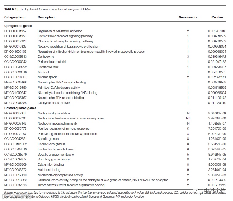 GO分析结果显示,对于BP,上调的DEGs在糖皮质激素和皮质类固醇受体信号通路、细胞基质粘附的调节、角质形成细胞增殖的负调节以及参与凋亡过程的线粒体膜通透性的调节中显着富集。下调的 DEG 显著富集中性粒细胞介导的免疫、脱粒和参与免疫反应的激活、免疫反应的正调节和白细胞介素 8 的产生。在 CC 中显着富集的上调 DEG 包括中心体、中心粒周围物质、收缩纤维和肌原纤维。在 CC 中显着富集的下调 DEG 包括特异性颗粒、特异性颗粒膜、分泌性和富含纤维蛋白胶蛋白 1 的颗粒腔。此外,27 条 KEGG 通路在 DEG 中富集。只有两个上调的DEGs,包括甲状腺激素信号通路和脂肪酸延长,而25个下调的DEGs在KEGG通路中显着富集,包括麻疹、Toll样受体信号通路、补体和凝血级联反应、乙型肝炎和甲型流感等。