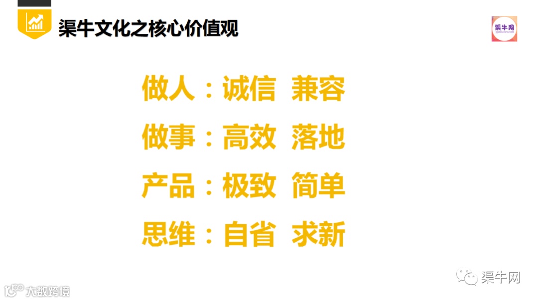 渠牛网的价值观从“做人、做事、产品、思维”四个方面确定了“诚信、兼容;高效、落地;极致、简单;自省、求新”八个准则要点,作为今后渠牛团队包括渠牛平台圈子的共同行为准则。