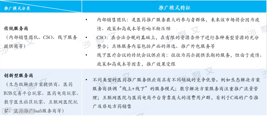 目前,中国医药推广服务可以分为传统医药推广模式和创新型医药推广模式两种推广模式。其中,创新型医药推广服务的模式拥有更加完善的履约和触达服务体系:药企通过采取数字系统实现线上拜访、线上学术会议、最新的医疗信息推送等加强与医护人员的联系,同时采取线下联络、定期拜访的方式,提高用户粘性,发掘更丰富的线下推广场景。