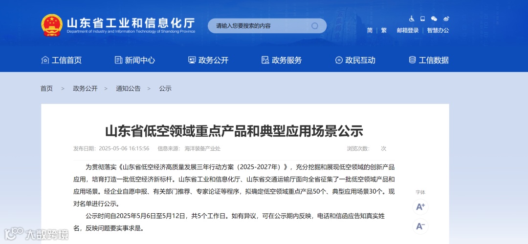 5月6日,山东省工业和信息化厅、山东省交通运输厅面向全省征集了一批低空领域产品和应用场景。