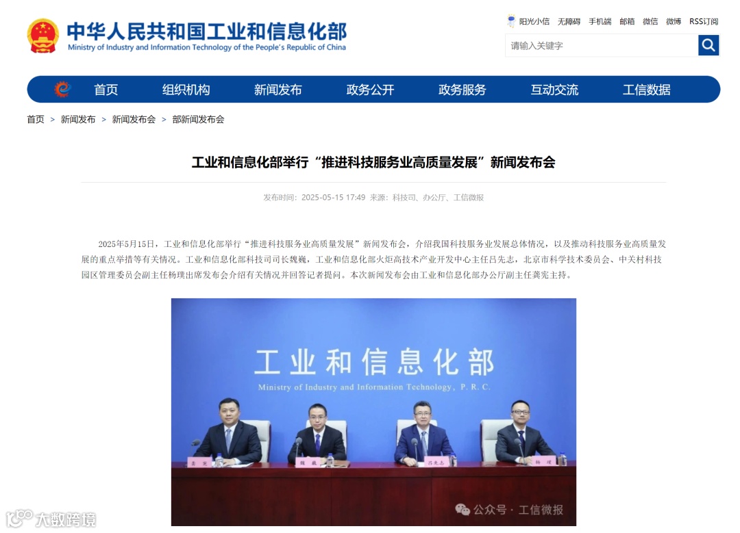 5月15日,工业和信息化部举行“推进科技服务业高质量发展”新闻发布会,介绍我国科技服务业发展总体情况,以及推动科技服务业高质量发展的重点举措等有关情况。