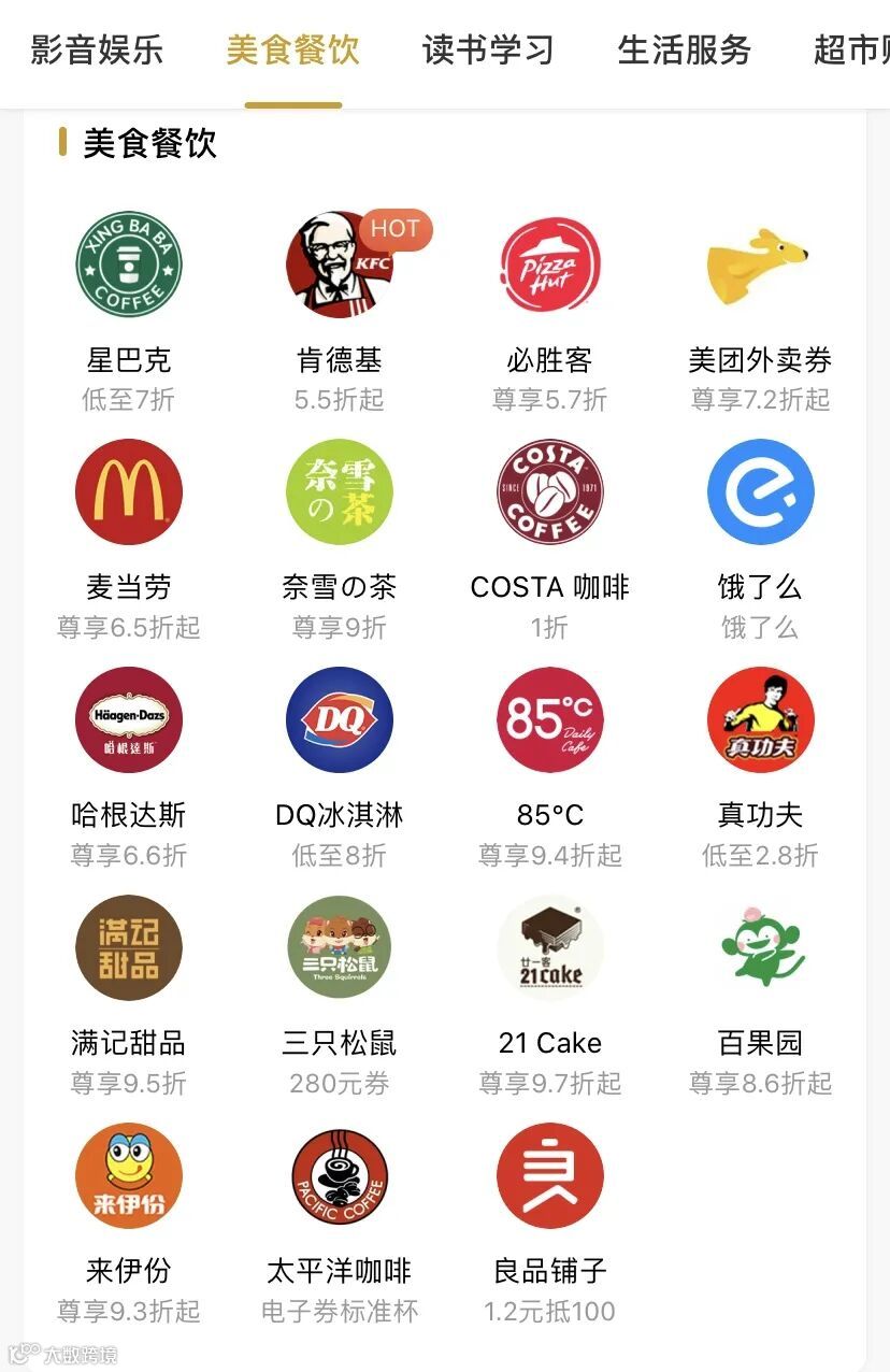 会员可享受知名餐饮品牌优惠,目前,臻金特权已经接入了年轻一族喜爱的大众餐饮品牌,例如星巴克、肯德基、哈根达斯、必胜客等热门连锁,用户可在鲁臻优选平台领取优惠券,买单时出示即可享受折扣。