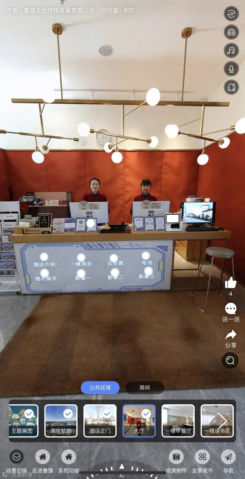 实景中,配合温馨有品位的音乐、语音解说、酒店宣传片等,多媒体手法为一体的高清晰度数字化实景漫游导览把酒店轻松“搬”到了客户面前,全面展示酒店信息,对外更好的宣传自己,树立品牌。