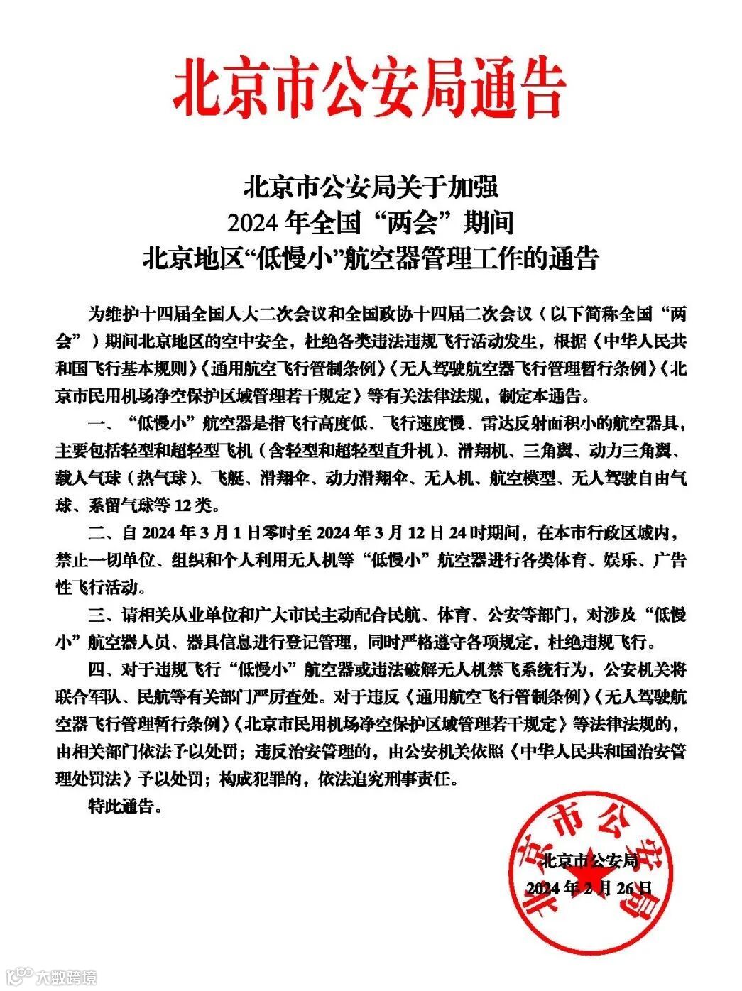 自2024年3月1日零时起至2024年3月12日24时期间,在本市行政区域内,禁止一切单位、组织和个人利用无人机等“低慢小”航空器进行各类体育、娱乐、广告性飞行活动
