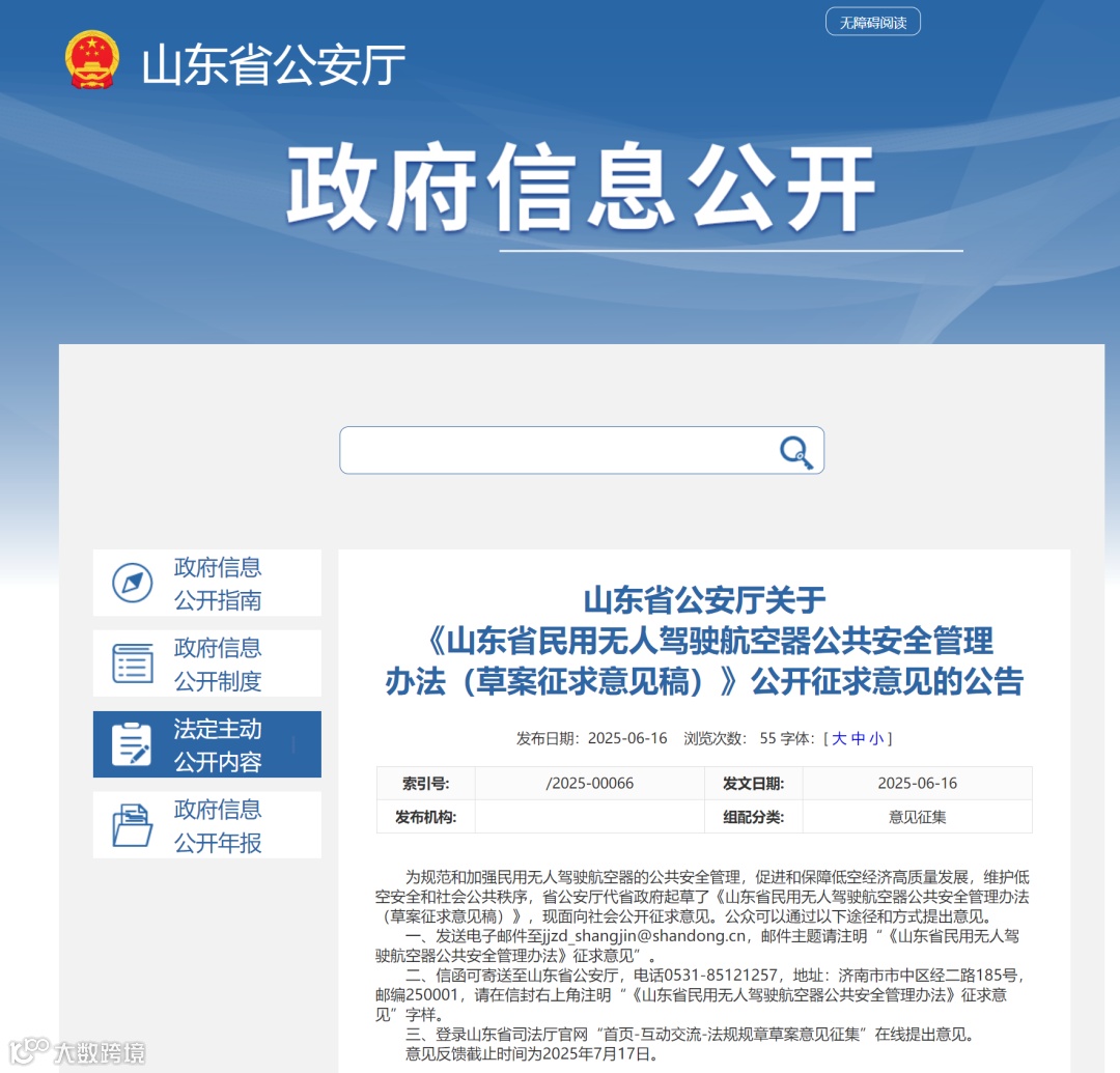 6月16日,山东省司法厅就《山东省民用无人驾驶航空器公共安全管理办法(草案征求意见稿)》公开征求意见。