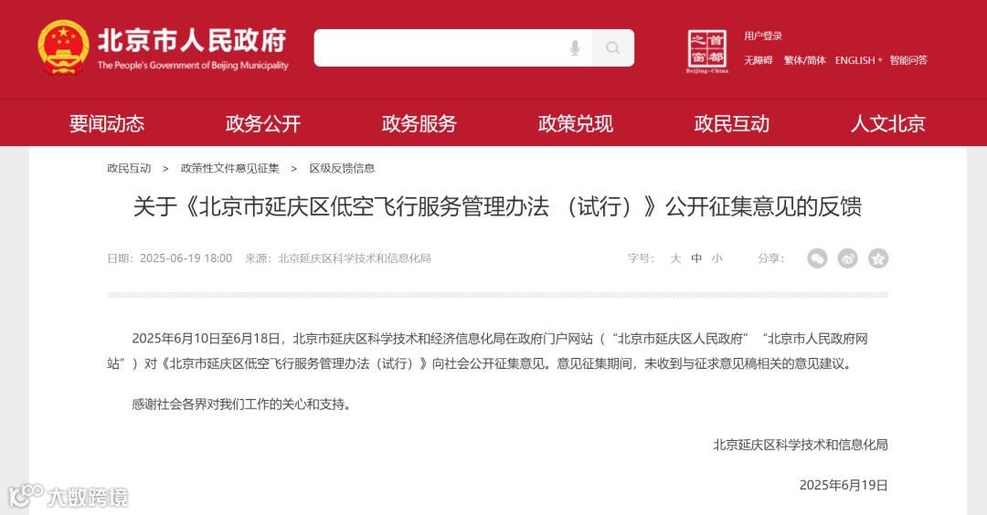 6月9日,《北京市延庆区低空飞行服务管理办法(试行)》公开征集意见。