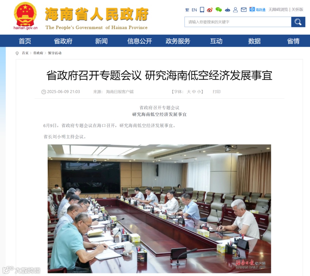 6月9日,海南省政府举行专题会议研究低空经济发展事宜。
