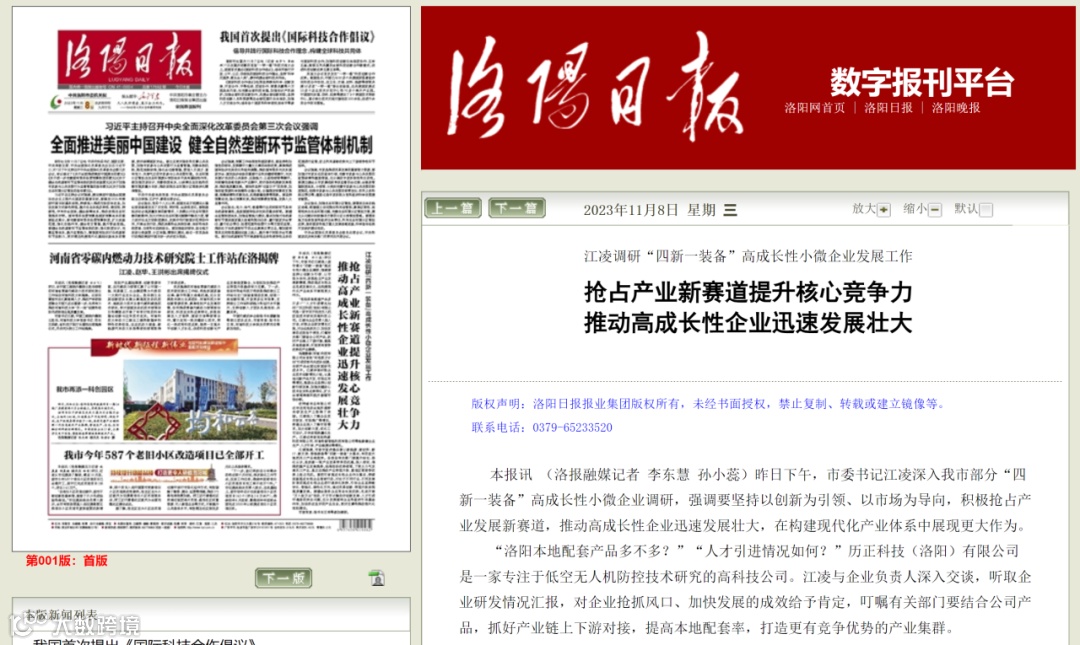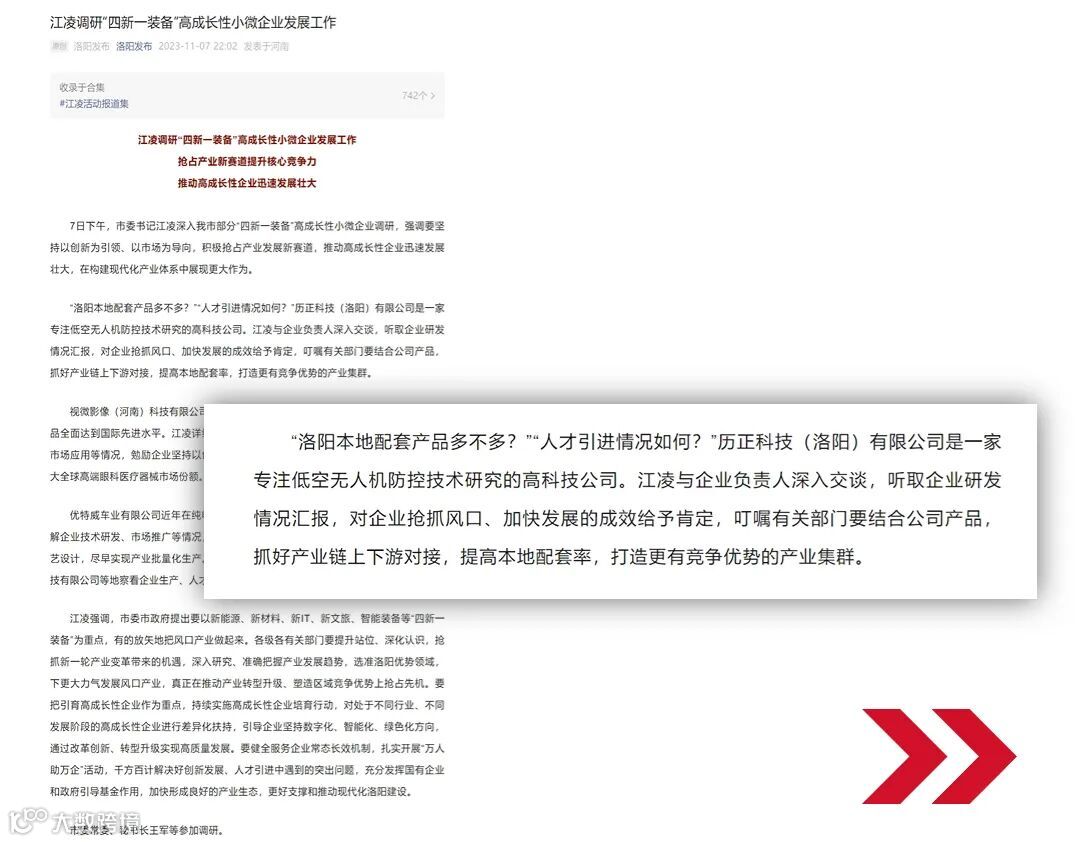 11月7日,洛阳市市委书记江凌莅临历正科技参观指导,强调要坚持以创新为引领、以市场为导向,积极抢占产业发展新赛道,推动高成长性企业迅速发展壮大,在构建现代化产业体系中展现更大作为。