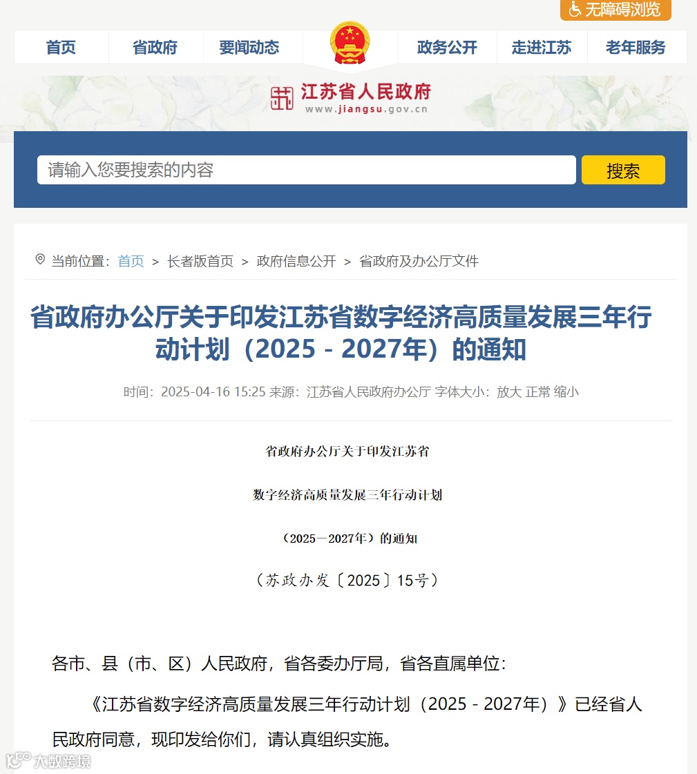 4月16日,江苏省政府办公厅印发《江苏省数字经济高质量发展三年行动计划(2025-2027年)》。