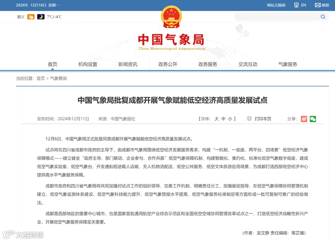 12月6日,中国气象局正式批复同意成都开展气象赋能低空经济高质量发展试点。