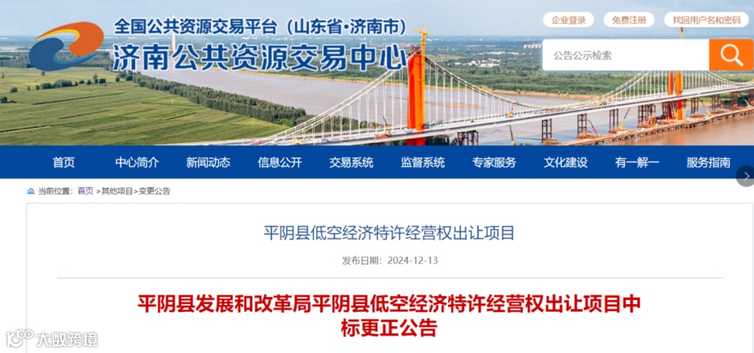12月13日,济南公共资源交易中心发布“平阴县发展和改革局平阴县低空经济特许经营权出让项目中标更正公告”。