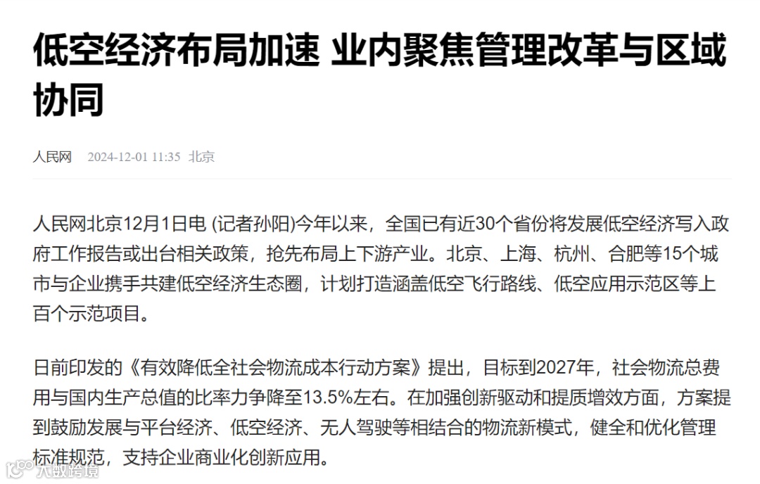 12月1日,人民网发表文章:《低空经济布局加速业内聚焦管理改革与区域协同》。