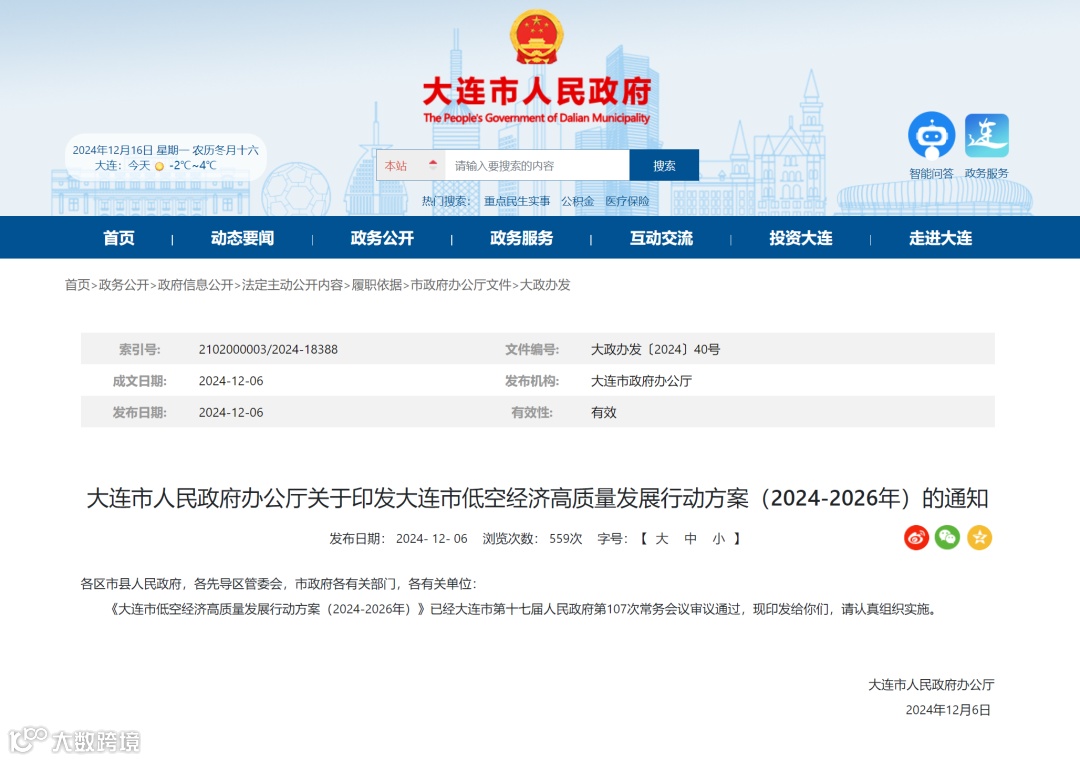 12月6日,辽宁大连市政府办公厅近日印发《大连市低空经济高质量发展行动方案(2024-2026年)》(以下简称《方案》)。