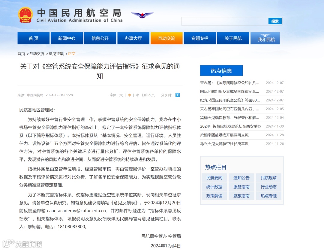 12月4日,民航局空管办、空管局发布通知,就《空管系统安全保障能力指标》征求意见 。