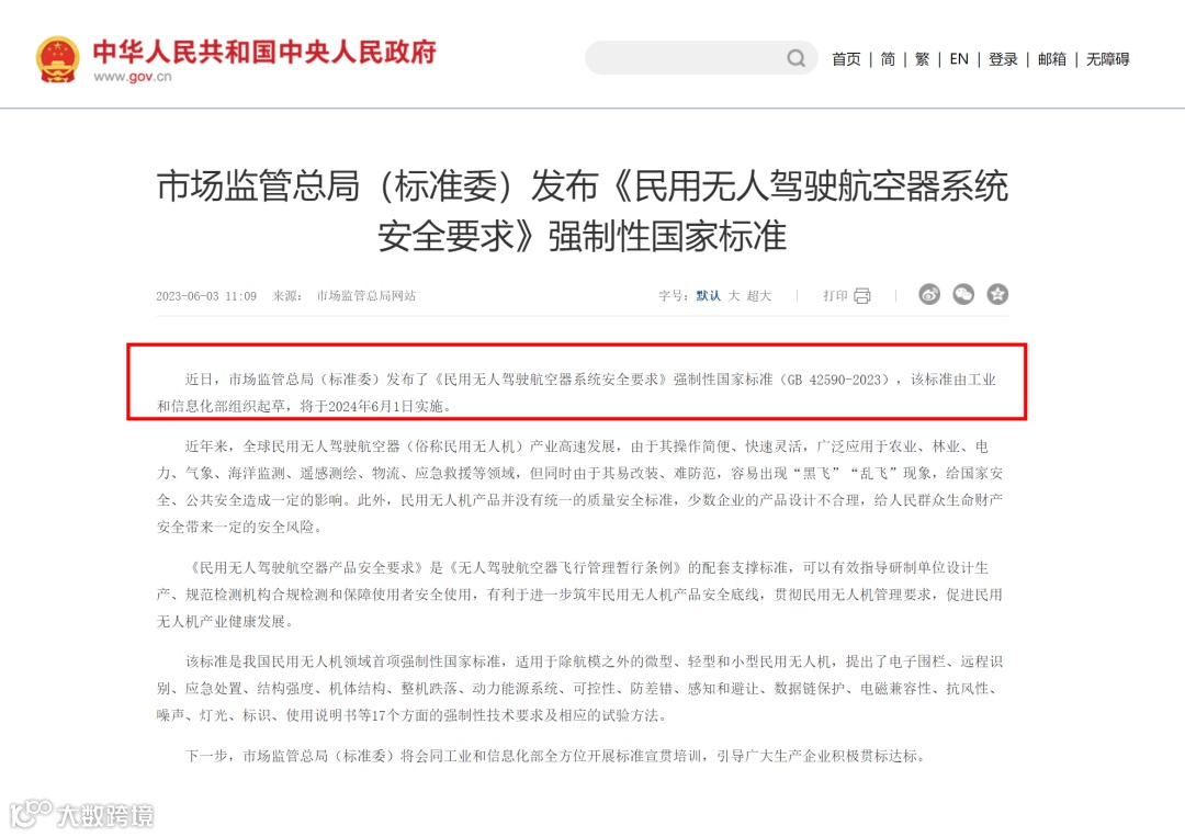 2024年6月1日,由工业和信息化部组织起草的我国首项强制性国家标准《民用无人驾驶航空器系统安全要求》强制性国家标准(GB 42590-2023)正式实施。