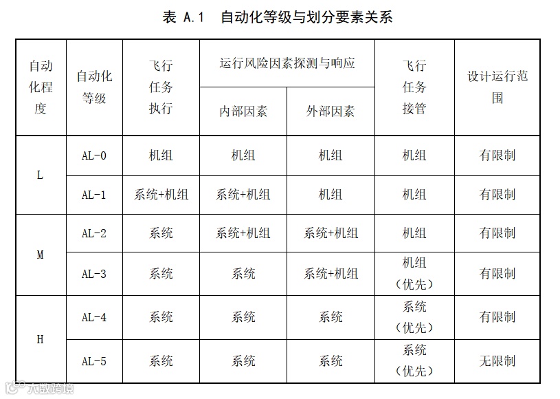 不同等级对风险因素的探测、响应、接管的控制权限,以及风险责任承担主体,有着明确的要求。其中AL-0级的机组权限最高,可随时接管飞行任务,系统只承担部分自动化功能,其他责任由机组承担。