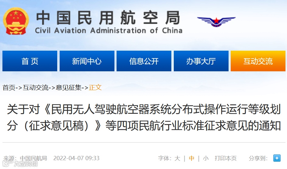 2022年4月07日,民航局发布“关于对《民用无人驾驶航空器系统分布式操作运行等级划分(征求意见稿)》等四项民航行业标准征求意见的通知”,对无人机生产厂家、无人机驾驶员、无人机反制厂家,提出更高职责要求。