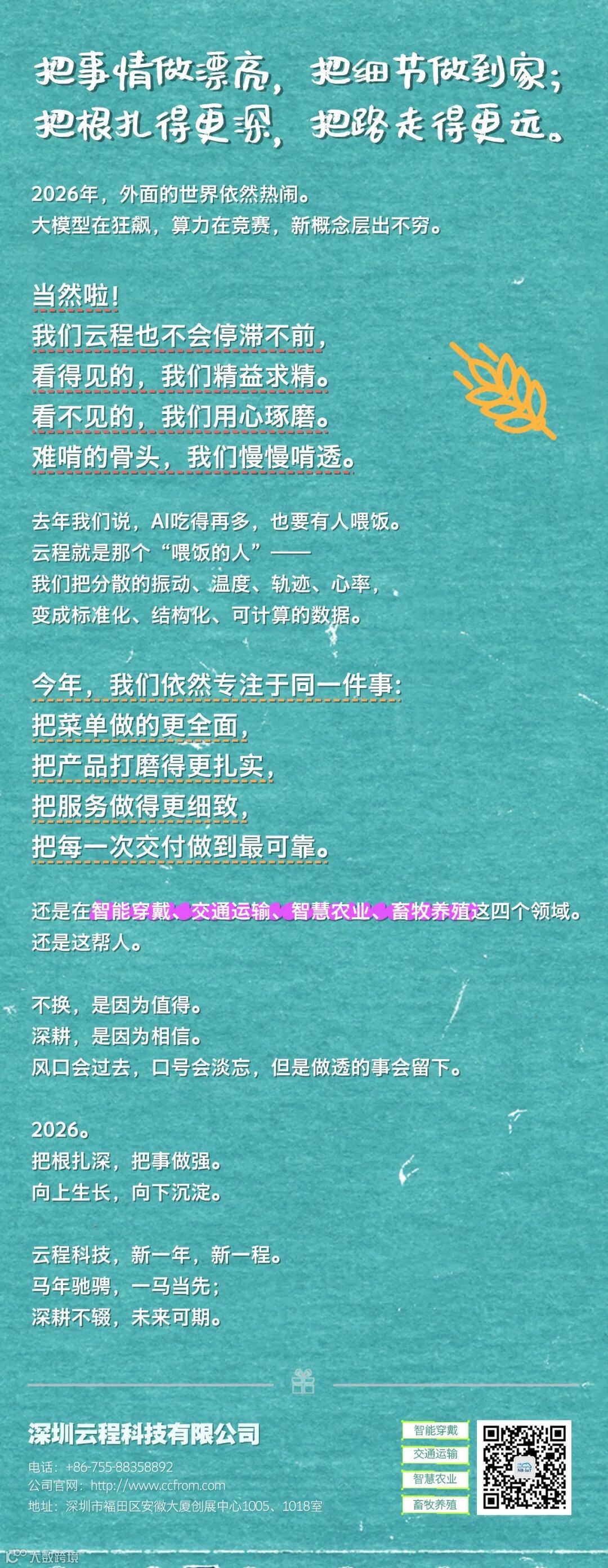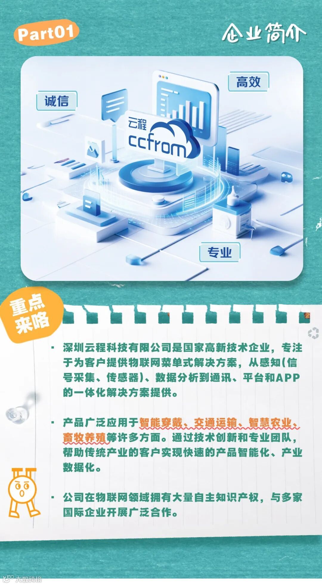 深圳云程科技有限公司位于福田区安徽大厦创展中心,是国家高新技术企业,专注于为客户提供物联网菜单式解决方案,从感知(信号采集、传感器)、数据分析、通讯、平台和APP的一体化解决方案商。产品广泛应用于工业控制、智慧农业、养殖、养老、交通运输、特种人员管理、智慧城市等许多方面。通过技术创新和专业团队,帮助传统产业的客户实现快速的产品智能化、产业数据化。公司在物联网领域拥有大量自主知识产权,与多家国际企业开展广泛合作。公司也是华为在蜂窝物联网领域的战略合作伙伴。