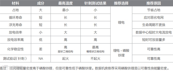 在数据中心场景目前普遍采用磷酸铁锂和三元锂 2 种电芯,磷酸铁锂可靠性更高,三元锂能量密度有优势。