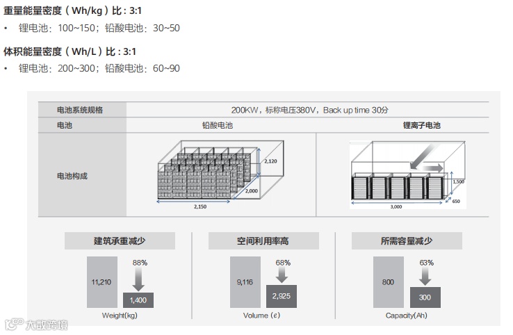 锂电和铅酸电池相同备电时间占地和承重对比图