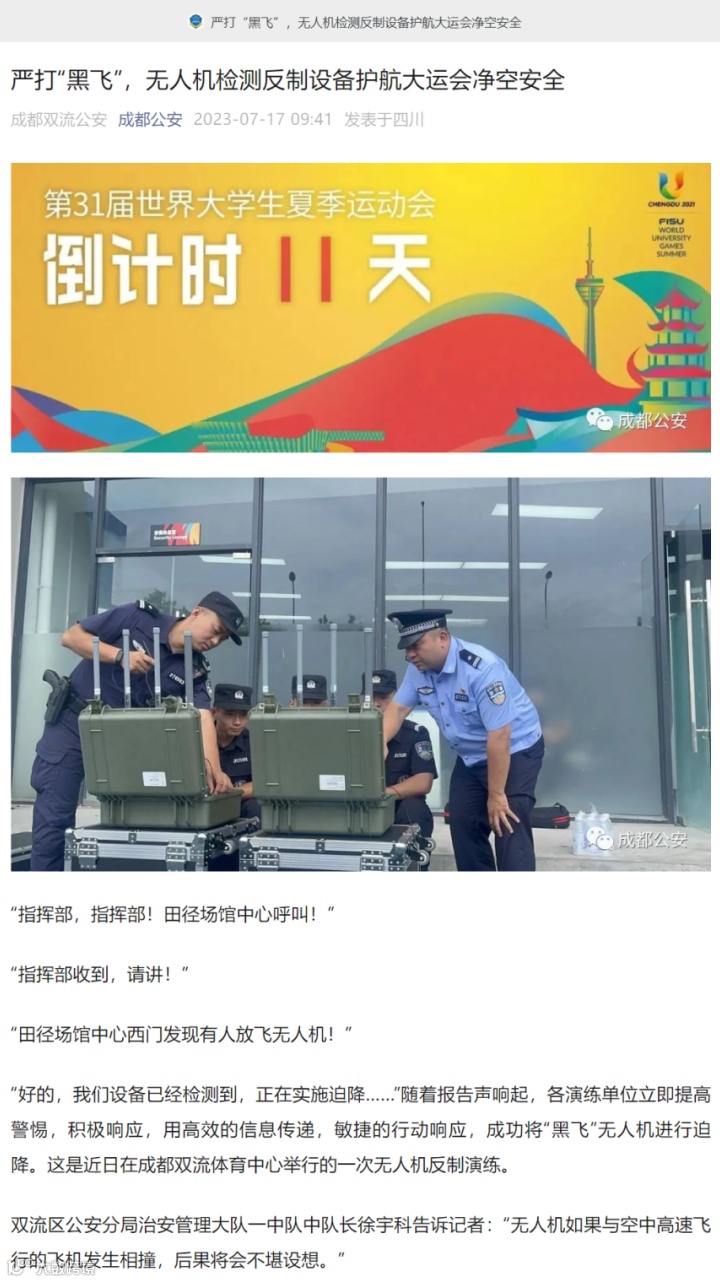 7月期间,参与成都大运会低空安防保障,《成都公安》发文报道设备保障情况