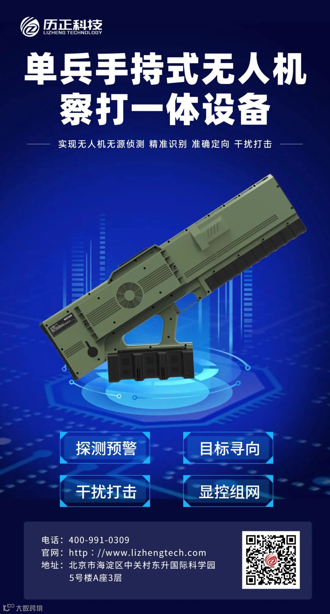 单兵手持式无人机察打一体设备集探测预警、目标寻向、干扰打击、显控组网功能于一体,实现了无人机无源侦测、精准识别、准确定向、干扰打击。